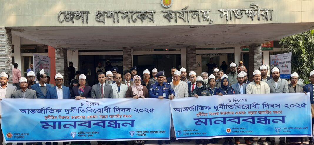 “দুর্নীতির বিরুদ্ধে তারুণ্যের একতা : গড়বে আগামীর শুদ্ধতা” এই প্রতিপাদ্যকে সামনে রেখে সাতক্ষীরায় আন্তর্জাতিক দুর্নীতি বিরোধী দিবস ২০২৫ উপলক্ষে মানববন্ধন ও আলোচনা সভা অনুষ্ঠিত হয়েছে।
