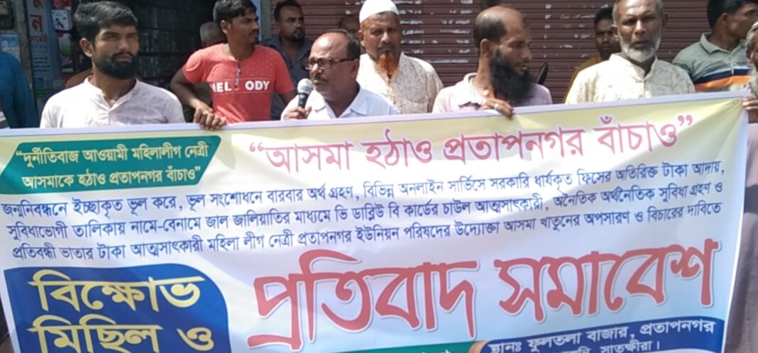 সমীর রায়, আশাশুনি : আশাশুনির প্রতাপনগর ইউনিয়ন পরিষদ তথ্য সেবা কেন্দ্রের উদ্যোক্তা আসমাউল হুসনা ওরফে আসমা কর্তৃক সরকারি চাল ও প্রতিবন্ধীদের অনুদানের অর্থ আত্মসাৎ এবং সীমাহীন দুর্নীতির প্রতিবাদে তাকে বহিষ্কারের দাবিতে বিক্ষোভ মিছিল ও প্রতিবাদ সমাবেশ করেছেন ভুক্তভোগী এলাকাবাসী। দাবি না মানা হলে সোমবার সকাল ১০টা থেকে ১১ টা পর্যন্ত প্রতিকী অনশন কর্মসূচি পালন করার ঘোষণা দিয়েছেন ভুক্তভোগী আন্দোলনকারীরা।