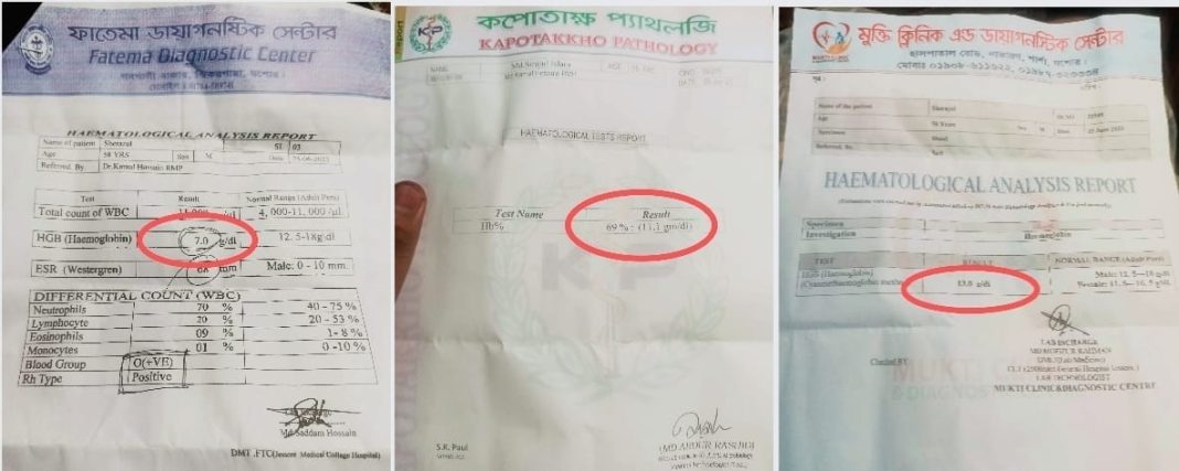 এম.আমিরুল ইসলাম জীবন:রক্তের হিমোগ্লোবিন পরীক্ষার রিপোর্টে একই ব্যাক্তির একই দিনে তিন ক্লিনিকে তিন রকম ফলাফল এসেছে। তিন রকম রিপোর্ট নিয়ে কিংকর্তব্যবিমুঢ় হয়ে পড়েছেন ভুক্তভোগী রুগী। চাঞ্চল্যকর এই ঘটনাটি ঘটেছে যশোরের ঝিকরগাছা উপজেলার গদখালির বাবুপাড়া গ্রামের সিরাজুল ইসলামের সাথে।