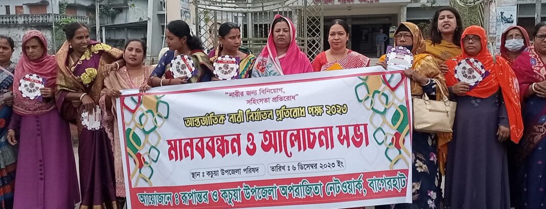 বাগেরহাট প্রতিনিধি:বাগেরহাটের কচুয়ায় বুধবার সকালে কচুয়া উপজেলা পরিষদের সামনে,নারীর জন্য বিনিয়োগ সহিংসতা প্রতিরোধ এই প্রতিপাদ্য বিষয়কে সামনে রেখে সকালে নারী অপরাজিতা নেটওয়ার্ক এর আয়োজনে একটি মানববন্ধন করেন।