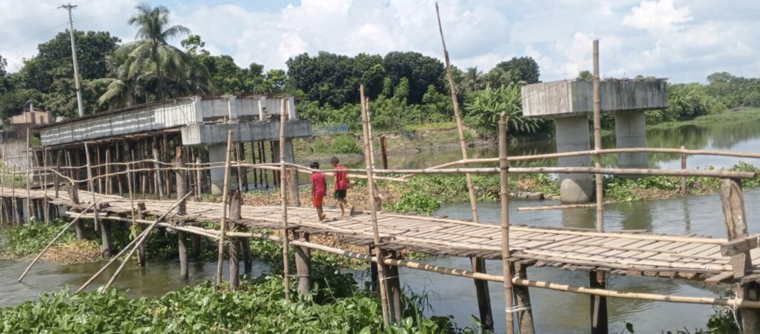 কিন্তু সরেজমিনে দেখা যায়, বেইলি ব্রিজের পরিবর্তে বাঁশ দিয়ে তৈরি একটি অস্থায়ী ও নড়বড়ে সাঁকো নির্মাণ করা হয়েছে। স্থানীয়দের দাবি, এই সাঁকোতে সর্বোচ্চ ১ লাখ ২০-৩০ হাজার টাকা ব্যয় হয়েছে, অথচ পুরো প্রকল্পের বিল তোলা হয়েছে।