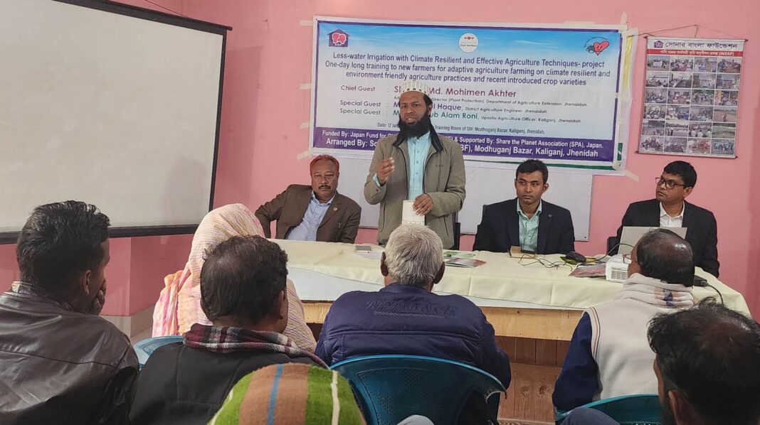 জলবায়ু সহিষ্ণু এবং কার্যকারী কৃষি কৌশল নির্ভরশীল পানি সাশ্রয়ী প্রকল্পের আওতায় কৃষকদের দিনব্যাপী প্রশিক্ষণ প্রদান করা হয়েছে। রোববার (১২ জানুয়ারি) সোনার বাংলা ফাউন্ডেশনের আয়োজনে সংগঠনের ট্রেনিং সেন্টারে এ প্রশিক্ষণ অনুষ্ঠিত হয়। কালীগঞ্জের কোলা ইউনিয়নের ২৫ জন কৃষক এ প্রশিক্ষণে অংশগ্রহন করেন।