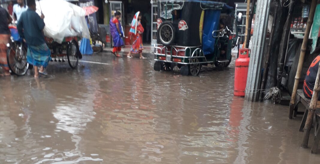 জমাট হওয়া পানি বেরিয়ে যাবার কোন সুব্যবস্থা না থাকায় সৃষ্টি হচ্ছে দীর্ঘকালীন জলবদ্ধতা। বৃষ্টি বেশি হলে পানি পাশের কাপুড়িয়া পট্টির গলিতে ঢুকে পড়ে। হাট চাঁদনীর সামনে তিন রাস্তার মোড়ে দোকান গুলো পানিতে তলিয়ে রয়েছে। দোকানিরা দোকান খুলে বসে থাকতে দেখা গেলও আগের মতো ক্রেতার দেখা মিলছে না। এ সময় একজন দোকানি উপায় না পেয়ে দোকানের সামনে জমে থাকা পানি নিজে বালতি দিয়ে অপসারণ করে।বিগত সরকারের আমলে পৌরসভা এলাকার প্রতিটি রাস্তার কাজ ব্যাপক নিম্ন মানের করা হয়েছে। রাস্তা নির্মানের বছর না পরেুতেই পিচ, পাথর, খোয়া উঠে চলাচলের অনুপযোগি হয়ে পড়ে।