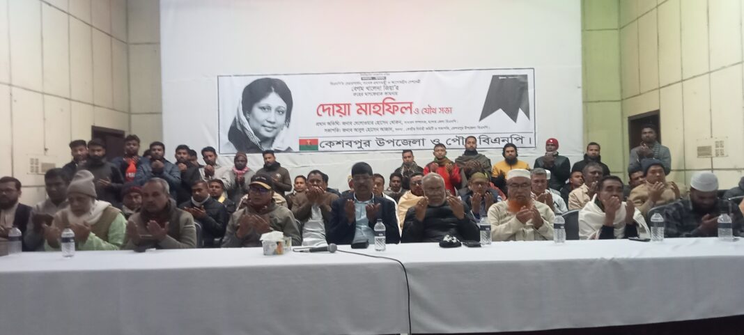 যশোরের কেশবপুরে বিএনপির চেয়ারপারসন, সাবেক প্রধানমন্ত্রী ও আপোষহীন দেশনেত্রী বেগম খালেদা জিয়ার রুহের মাগফিরাত কামনায় দোয়া মাহফিল এবং যৌথ সভা অনুষ্ঠিত হয়েছে। গতকাল রোববার বিকেলে উপজেলা ও পৌর বিএনপির উদ্যোগে ওই মাহফিলে এবং সভা অনুষ্ঠিত হয়।