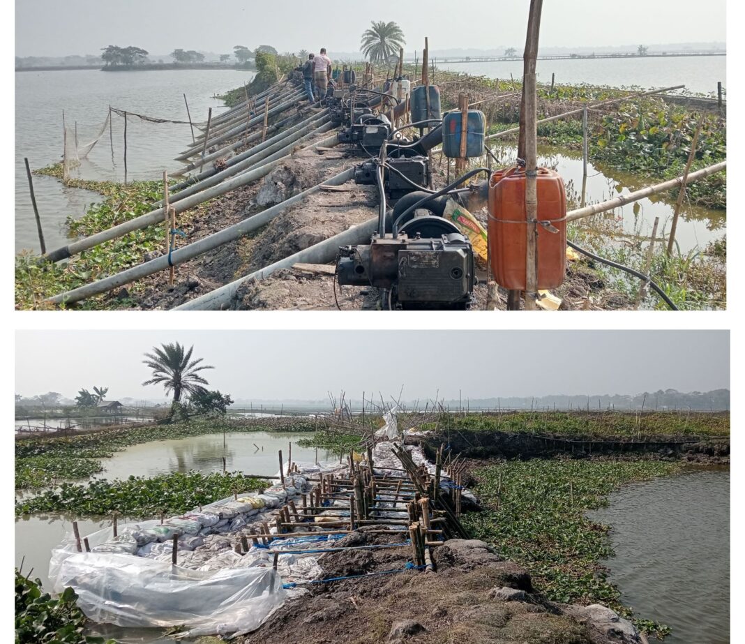 ঘের মালিক মেজবাহউদ্দীন মিল্টন জানান, উপজেলার পশ্চিম সারুটিয়ার বরুনার বিলে তার ৪০০ বিঘা জমির ২টি মাছের ঘের রয়েছে। ২৫/২৬টি মেশিন দিয়ে ঘেরের পানি নিষ্কাশন চলছিল। নির্ধারিত সময়ে ঘেরের পানি নিষ্কাশন সম্ভব ছিল। কিন্তু পাশর্^বর্তী ঘেরের কিছু কুচক্রিমহল বুড়–লি খালের বাধ কেটে দেয়ায় তাঁর ঘের আবার পানিতে তলিয়ে যায়। খালের বাধ সংস্কার করে পুণরায় ঘেরের পানি নিষ্কাশন চলছিল। ৩০ পৌষের ৭ দিন বাকি থাকা অবস্থায় সেচ বন্ধ করা হয়েছে। ঘেরে এক থেকে দেড় ফুট পানি আছে। যে কারণে বিলের শতাধিক কৃষক বোরো আবাদ করতে পারছে না। আর দুই দিন সময় পেলে ঘেরের পানি সম্পূর্ণ নিষ্কাশন হয়ে যেত। শুধু মিল্টনের ঘের নয় ওই অঞ্চলের প্রায় অর্ধশত ঘেরের একই অবস্থা।