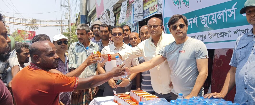 উপজেলা জুয়েলার্স অ্যাসোসিয়েশনের সভাপতি কনক কুমার সেনের পরিচালনায় এ সময় উপস্থিত ছিলেন সংগঠনের উপদেষ্টা মনোরঞ্জন দে, সহসভাপতি তপন দে, সাধারণ সম্পাদক আব্দুস সাত্তার মিন্টু, যুগ্ম সম্পাদক কার্তিক রায়, জুয়েলার্স অ্যাসোসিয়েশনের মধুসূুদন কর্মকার, মিলন দে, উৎপল দে, সঞ্জয় সেন, আশিষ দে, রনজিত পাল, সঞ্জয় দে, সুমন দাস, মহাদেব সেন, উজ্জ্বল সেন প্রমুখ। তীব্র গরমের ভেতর খাবার স্যালাইন ও পানি পেয়ে শ্রমজীবী মানুষেরা খুশি প্রকাশ করেন। #