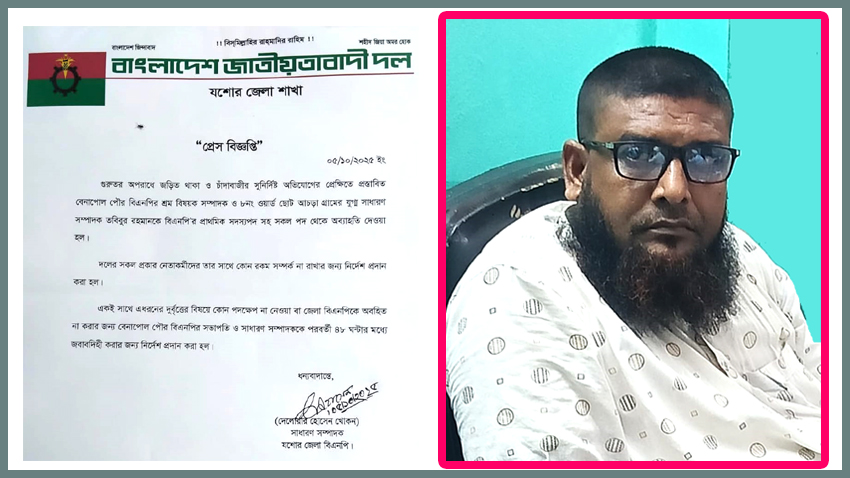 চাঁদাবাজীর সুনির্দিষ্ট অভিযোগের প্রেক্ষিতে যশোর জেলা বিএনপির সাধারণ সম্পাদক মোঃ দেলোয়ার হোসেন খোকন স্বাক্ষরিত এক চিঠিতে তাকে বিএনপির সমস্ত পদ থেকে অব্যাহতির বিষয়টি নিশ্চিত করেছেন।