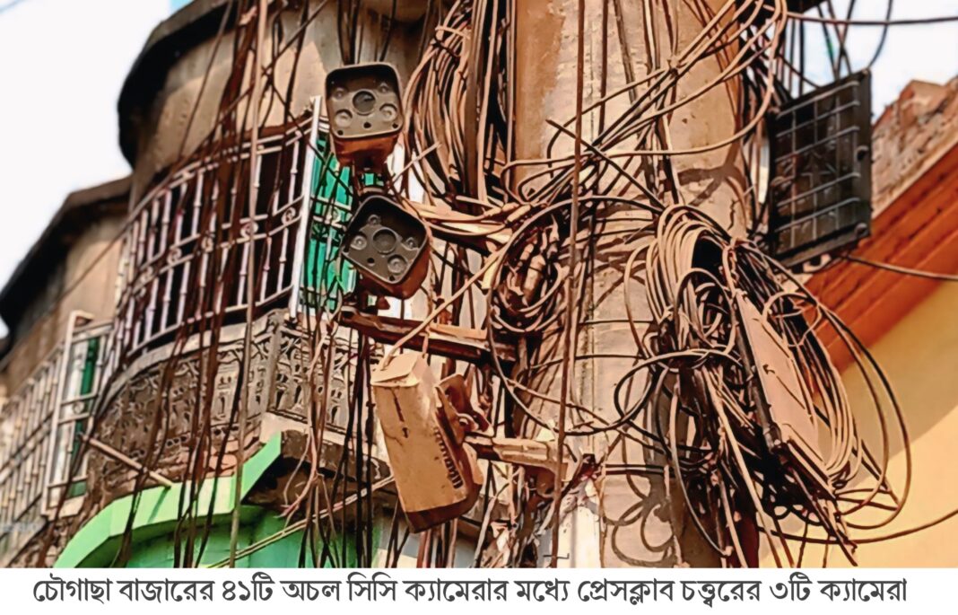 যশোরের চৌগাছা বাজারের সিসি ক্যামেরা ব্যবস্থা বর্তমানে অচল হয়ে পড়েছে, যা ব্যবসায়ী ও সাধারণ মানুষের নিরাপত্তা নিয়ে নতুন করে উদ্বেগ সৃষ্টি করেছে। বাজারের নিরাপত্তা ব্যবস্থার অন্যতম প্রধান অংশ হিসেবে পৌরসভা কর্তৃক ৪১টি সিসি ক্যামেরা বসানো হলেও, দীর্ঘদিন ধরে এই ক্যামেরাগুলি সচল নেই। সোমবার (১০ মার্চ) সকাল থেকে বাজারের বিভিন্ন গুরুত্বপূর্ণ পয়েন্টে ঘুরে ঘুরে এ চিত্র দেখা যায়।