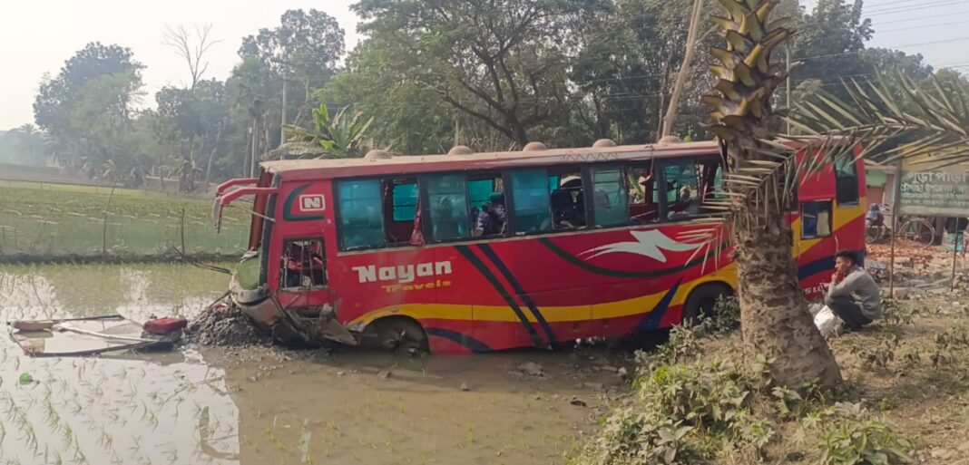 আহতরা জানান, যশোর মনিহার-খুলনা রুটের যাত্রীবাহী ‘গড়াই’ পরিবহনের একটি বাস (ঢাকা মেট্রো-ব-১৪-৩১২৫) মহেশপুর উপজেলার বাথানগাছি গ্রামে বিয়ে শেষে বরযাত্রী নিয়ে যশোরের নওয়াপাড়ার দিকে যাচ্ছিল। পথে টেঙ্গুরপুর মোড়ে পৌঁছালে সামনে থাকা স্পিড ব্রেকারটি চালক খেয়াল না করায় বাসটি নিয়ন্ত্রণ হারিয়ে সড়কের পাশের খাদে পড়ে যায়।