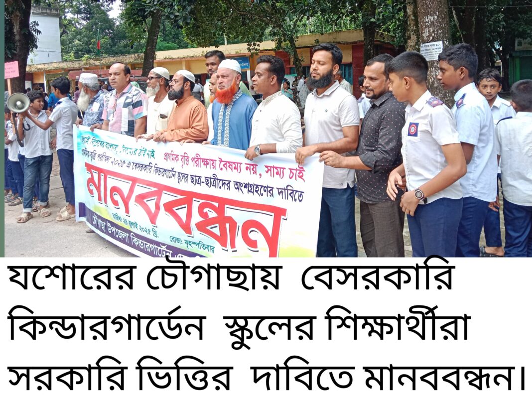 শ্যামল দত্ত চৌগাছা (যশোর) প্রতিনিধি: যশোরের চৌগাছায়  বেসরকারি  কিন্ডার গার্ডেন স্কুলের শিক্ষক  শিক্ষার্থীরা  সরকারি বৃত্তি পরীক্ষার দাবিতে স্মারক লিপি  প্রদান ও  মানববন্ধ অনুষ্ঠিত হয়েছে। রবিবার(২৭ জুলাই) সকাল ১১ টার উপজেলা পরিষদের সামনে ৮ টি বেসরকারি কিন্ডার গার্ডেন স্কুলের শিক্ষক ও শিক্ষার্থীরা মানববন্ধন করেন ।