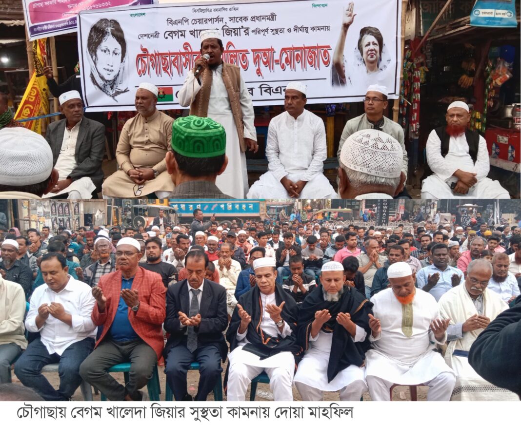 বিএনপি চেয়ারপার্সন ও দেশনেত্রী, সাবেক প্রধানমন্ত্রী বেগম খালেদা জিয়ার দ্রুত সুস্থতা, দীর্ঘায়ু ও সম্পূর্ণ আরোগ্য কামনায় যশোরের চৌগাছায় পৌর বিএনপির উদ্যোগে দোয়া ও মোনাজাত অনুষ্ঠিত হয়েছে।