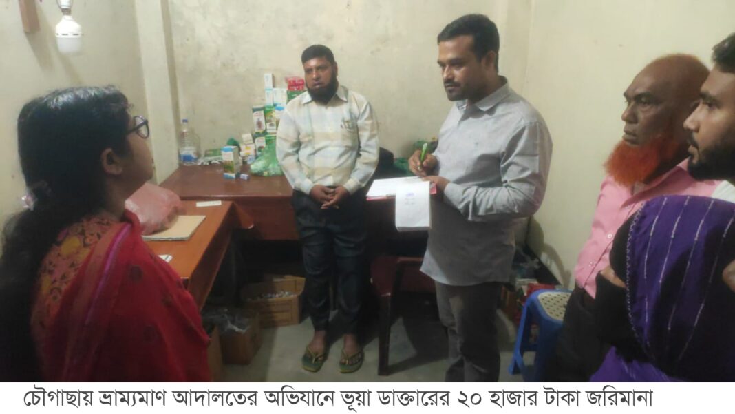 যশোরের চৌগাছায় ভ্রাম্যমাণ আদালতের অভিযানে এক ভূয়া ডাক্তারকে ২০ হাজার টাকা জরিমানা করা হয়েছে। বুধবার (২২ অক্টোবর) দুপুরে এ অভিযান পরিচালনা করেন উপজেলা সহকারী কমিশনার (ভূমি) ও নির্বাহী ম্যাজিস্ট্রেট তাসমিন জাহান।