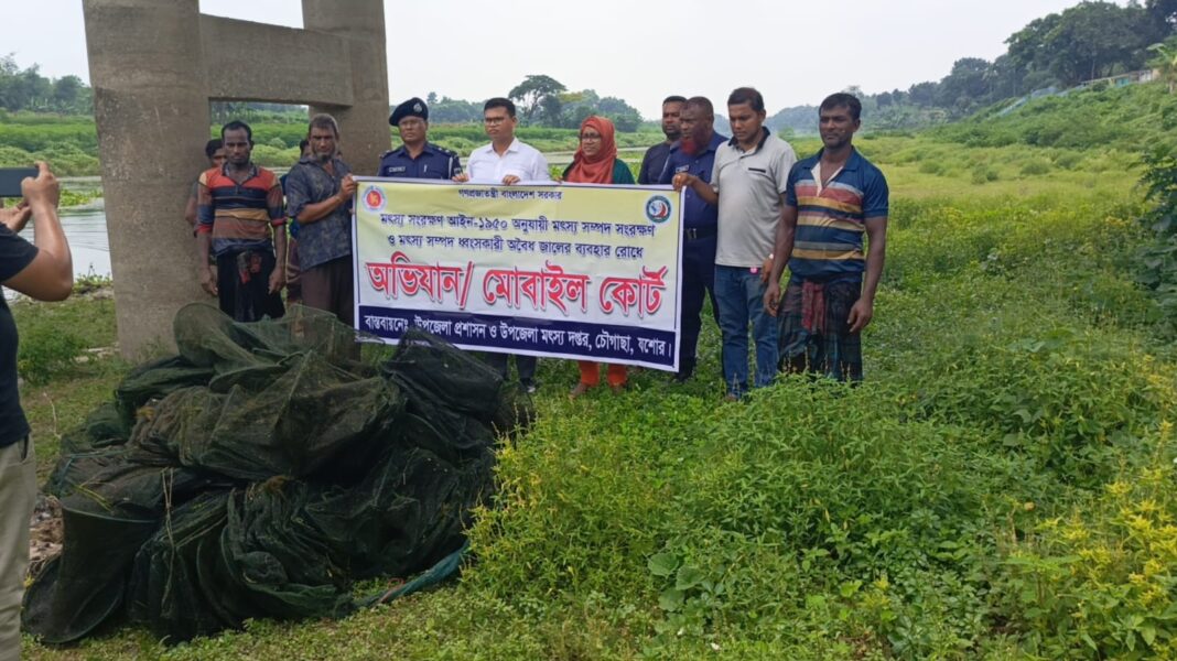 যশোরের চৌগাছায় ভ্রময়মান আদালতের মাধ্যমে ৬০ হাজার টাকার চায়না দুয়ারী ও কারেন্ট জাল জব্দ করে পুড়ানো হয়েছে। বৃহস্পতিবার (১০ জুলাই) দুপুর ১ টায় উপজেলা মৎস্য অফিসের উদ্যোগে এ জাল পোড়ানো হয়।