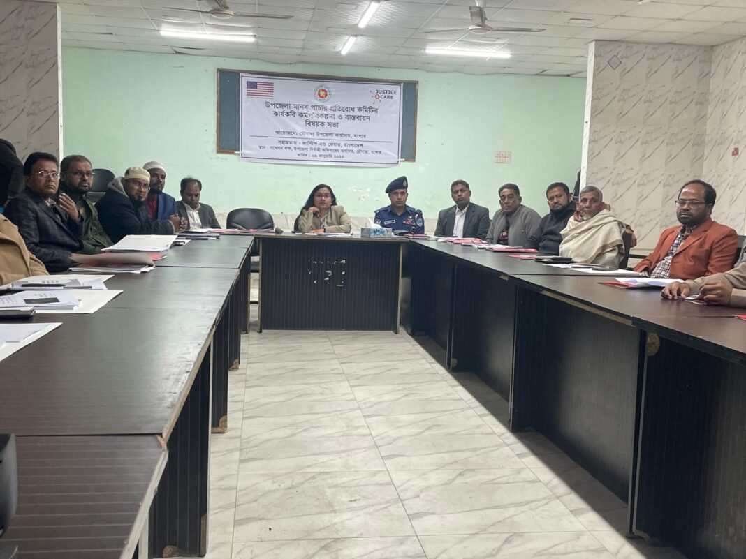শ্যামল দত্ত , চৌগাছা পৌর প্রতিনিধি:যশোরের চৌগাছায় উপজেলা মানব পাচার প্রতিরোধ কমিটির কার্যকরি কর্মপরিকল্পনা ও বাস্তবায়ন বিষয়ক সভা অনুষ্ঠিত হয়েছে। বৃহস্পতিবার (৯জানুয়ারী) বেলা ১১টায় চৌগাছা উপজেলা প্রশাসন ও জাস্টিস এন্ড কেয়ারের যৌথ উদ্যোগে উপজেলা পরিষদ সভাকক্ষে এই সভা অনুষ্ঠিত হয়।