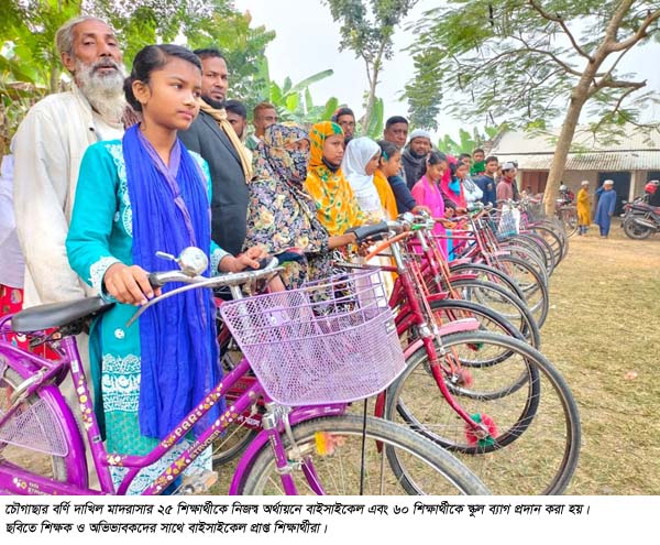 মাদরাসাটির সহ-সুপার জাহিদুল ইসলাম বলেন, আমাদের অনেক ছেলে ও মেয়ে শিক্ষার্থী অনেক দূরের পথ হেটে মাদরাসায় আসে। এদের অনেকেই আছে যারা খুবই গরীব। তাদের পরিবারের পক্ষে সাইকেল কিনে দেয়া বা কোন যানবাহনের ব্যবস্থা করা অসম্ভব। এজন্য নিজস্ব অর্থায়নে আমরা গরীব ও মেধাবী ২৫জন ছাত্র-ছাত্রীকে বাইসাইকেল কিনে দিয়েছি। এছাড়া ৬০ শিক্ষার্থীকে স্কুল ব্যাগ কিনে দেয়া হয়েছে।#