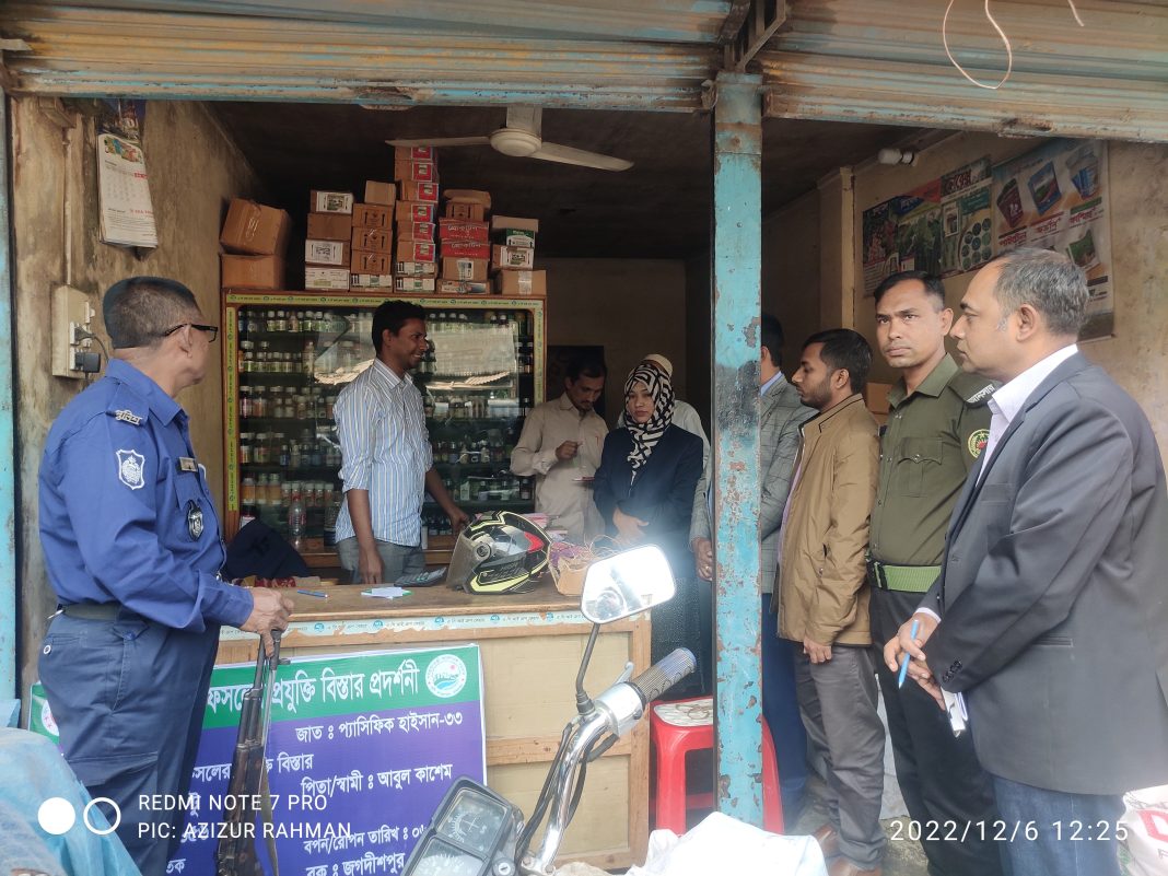 আদালত পরিচালনাকালে দেখা যায়, বিশ^াস ট্রেডার্সের সার বিক্রির কোন লাইসেন্স নেই। অথচ তিনি ইউরিয়া ও ডিএপি সার মজুদ রেখে অতিরিক্ত দামে বিক্রি করছেন। এসময় সার ও বীজ সংরক্ষণ আইন ২০০৬ এর আওতায় অবৈধভাবে সার মুজদ রেখে অতিরিক্ত দামে বিক্রির অপরাধে বিশ^াস ট্রেডার্সের সত্বাধিকারীকে ৫ হাজার টাকা জরিমানা এবং দোকানে থাকা ২৪ বস্তা ডিএপি ও ১৫ বস্তা ইউরিয়া সার জব্দ করা হয়। এছাড়া অতিরিক্ত দামে সার বিক্রি করার অপরাধে আরমান এন্টার প্রাইজের সত্বাধিকারীর কাছ থেকে ১০ হাজার টাকা জরিমানা আদায় করা হয়।