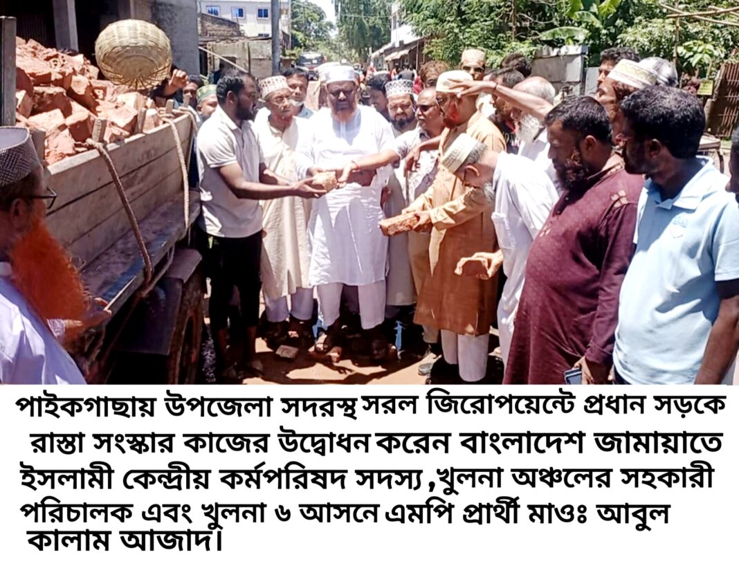 পাইকগাছা প্রতিনিধি: পাইকগাছা উপজেলা সদরস্থ সরল জিরোপয়েন্টে প্রধান সড়ক সংস্কার কাজের উদ্বোধন ও গণসংযোগ কালে বাংলাদেশ জামায়াতে ইসলামী কেন্দ্রীয় কর্মপরিষদ সদস্য, খুলনা অঞ্চলের সহকারী পরিচালক ও খুলনা- ৬ (কয়রা -পাইকগাছা) সংসদীয় আসনের মনোনীত প্রার্থী মাওলানা আবুল কালাম আজাদ বলেছেন, বাংলাদেশ জামায়াতে ইসলামী এমন একটি দল যা একটি মানবিক ও জনকল্যাণমূলক রাজনীতিতে বিশ্বাসী। আমরা রাজনীতি করি জনগণের সেবা করার জন্য, সমাজের পরিবর্তনের হাতিয়ার হিসেবে।