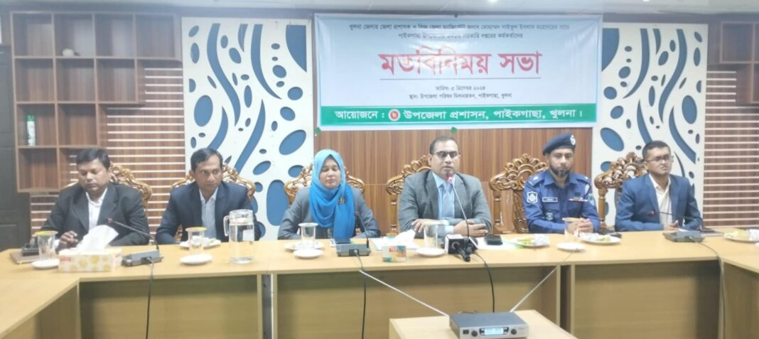 বৃহস্পতিবার সকালে পাইকগাছা উপজেলা পরিষদ মিলনায়তনে উপজেলা নির্বাহী অফিসার মাহেরা নাজনীন এর সভাপতিত্বে মতবিনিময় সভায় বক্তব্য রাখেন, পানি উন্নয়ন বোর্ডের পাইকগাছা উপ- বিভাগীয় প্রকৌশলী এস এম রিফাত -বিন-রফিক, জনপ্রতিনিধিদের মধ্যে বীর মুক্তিযোদ্ধা চেয়ারম্যান আবুল কালাম আজাদ, গনমাধ্যম কর্মীদের মধ্যে পাইকগাছা প্রেসক্লাবের সাধারণ সম্পাদক এম মোসলেম উদ্দিন আহমেদ।