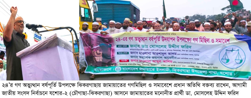 আলমগীর হোসেন আলম, ঝিকরগাছা : ২৪’র গণ অভ্যুত্থান বর্ষপূর্তি উদযাপন উপলক্ষে যশোরের ঝিকরগাছায় বাংলাদেশ জামায়াতে ইসলামী উপজেলা শাখার আয়োজনে গণমিছিল ও সমাবেশ অনুষ্ঠিত হয়েছে।