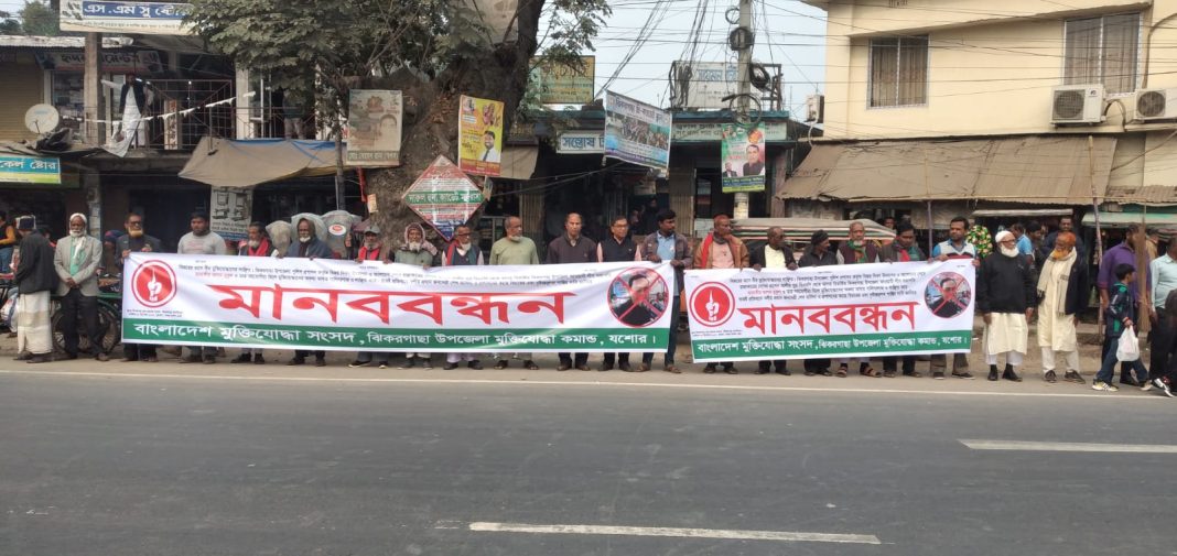 ঘন্টা ব্যাপী মানববন্ধনে ঝিকরগাছা উপজেলার মুক্তিযোদ্ধা, সাধারণ মানুষ অংশগ্রহণ করেন।