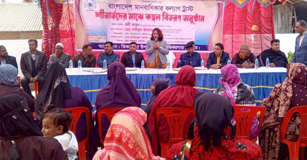 আলমগীর হোসেন আলম, ঝিকরগাছা : যশোরের ঝিকরগাছায় অসহায়, দুস্থ, অবহেলিত, প্রতিবন্ধী ও বিধবা শীতার্তদের মাঝে বাংলাদেশ মানবাধিকার কল্যাণ ট্রাস্টের কম্বল বিতরণ করেন উপজেলা নির্বাহী অফিসার ও উপজেলা প্রশাসক মোছাঃ রনী খাতুন। তিনি প্রধান অতিথির বক্তব্যে বলেন, সরকারে কাজ করছে বাংলাদেশ মানবাধিকার কল্যাণ ট্রাস্ট।