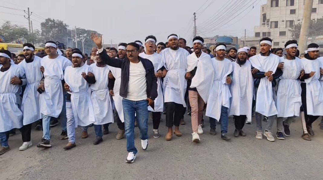 ঝিনাইদহে রাশেদ খানকে অবাঞ্চিত ঘোষনা, কাফনের কাপড় পরে বিক্ষোভ