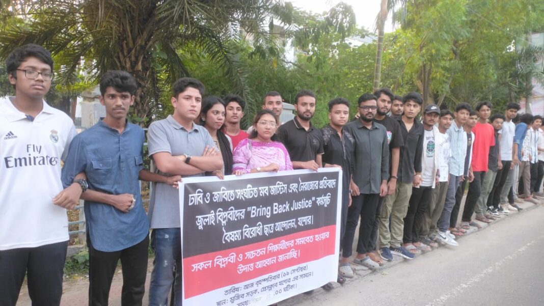 নিজস্ব প্রতিবেদক:ঢাবি ও জাবিতে সংঘটিত মব জাস্টিস এবং নৈরাজ্যের প্রতিবাদে জুলাই বিপ্লবীদের “Bring Back Justice” মানববন্ধন কর্মসূচি পালন করেছে বৈষম্য বিরোধী ছাত্র আন্দোলন, যশোর। বৃহস্পতিবার (১৯ সেপ্টেম্বর) বিকেল ৪টায় প্রেসক্লাব যশোরের সামনে এ কর্মসূচি পালন করে শিক্ষার্থীরা।