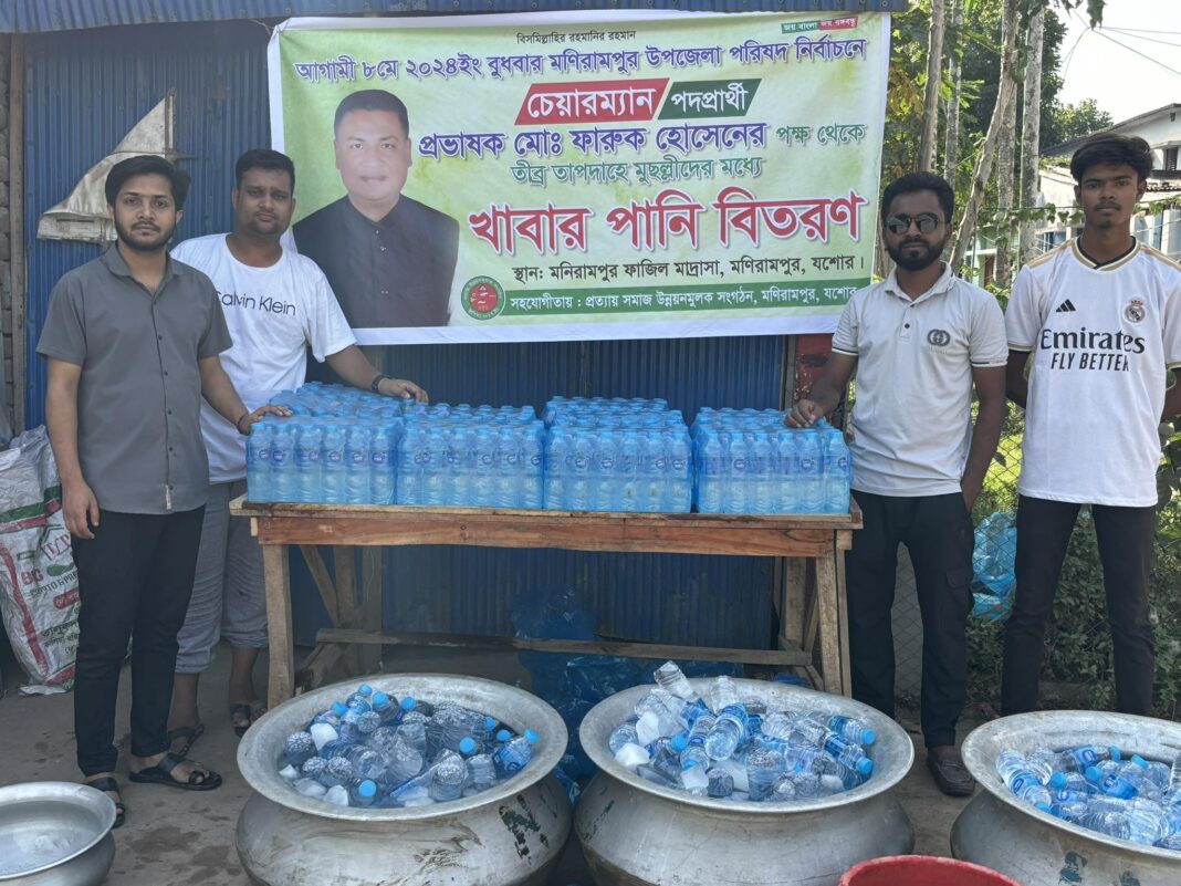আসন্ন উপজেলা পরিষদ নির্বাচনে চেয়ারম্যান পদপ্রার্থী মনিরামপুর উপজেলা আওয়ামীলীগের সাধারণ সম্পাদক প্রভাষক মোঃ ফারুক হোসেনের পক্ষ থেকে এবং প্রত্যয় সমাজ উন্নয়ন মূলক সংগঠনের সহযোগীতায় ওয়াজ মাহফিলে দূরদুরান্ত থেকে আগত ধর্মভিরু মুসলমানদের মধ্যে তীব্র তাপদাহে ১০০০ বোতল বিশুদ্ধ খাবার পানি বিতরণ করা হয়।