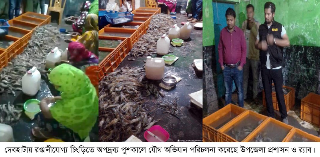 দেবহাটা উপজেলা নির্বাহী অফিসার এবিএম খালিদ হোসেন সিদ্দিকী এবিষয়ে বলেন, প্রশাসনের চোখকে ফাঁকি দিয়ে দীর্ঘদিন ধরে পারুলিয়ার আমিন ফিসের মালিক আলহাজ¦ নূর আমিন গাজী এবং আলিফ ফিসের মালিক মাসুদ রানা সহ বেশ কয়েকজন ডিপো মালিক অতি মুনাফার লোভে রপ্তানীযোগ্য বাগদা ও গলদা চিংড়িতে জেলি, ফিটকিরি, সাগুদানা, ভাতের মাড়সহ নানা ধরনের অপদ্রব্য ইনজেকশনের সিরিঞ্জের মাধ্যমে পুশ করে আসছিল। অপদ্রব্য পুশের কাজে তারা স্বল্প পারিশ্রমিকের বিনিময়ে স্থানীয় অসহায়, দুঃস্থ, বিধবা ও ডিভোর্সী নারীদের শ্রমিক হিসেবে ব্যবহার করতো। বুধবার গোপন সংবাদের ভিত্তিতে র‌্যাপিড অ্যাকশন ব্যাটেলিয়ন ও উপজেলা প্রশাসন যৌথ অভিযান পরিচালনা করে তাদের আটক পরবর্তী বিভিন্ন মেয়াদে কারাদন্ড প্রদান, জরিমানা আদায় ও জব্দকৃত ৪৩০ কেজি চিংড়ি জনসম্মুখে ধ্বংস করা হয় বলেও জানান তিনি। এসময় উপজেলা মৎস্য অফিসার আলমগীর হোসেনসহ র‌্যাপিড অ্যাকশন ব্যাটেলিয়ানের অফিসাররা উপস্থিত ছিলেন।