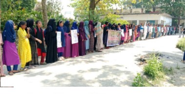 কর্মসূচির শুরুতে সরকারি কলেজ চত্বর থেকে একটি বিক্ষোভ মিছিল বের হয়ে বিভিন্ন সড়ক প্রদক্ষিণ করে উপজেলা পরিষদ চত্বরে গিয়ে নানা শ্লোগানে এলাকা প্রকম্পিত করে তোলে। এখানে প্রতীকি ধর্ষকের কুশপুত্তলিকা দাহ করে উপজেলা পরিষদের সামনের সড়কে মানববন্ধন করা হয়।