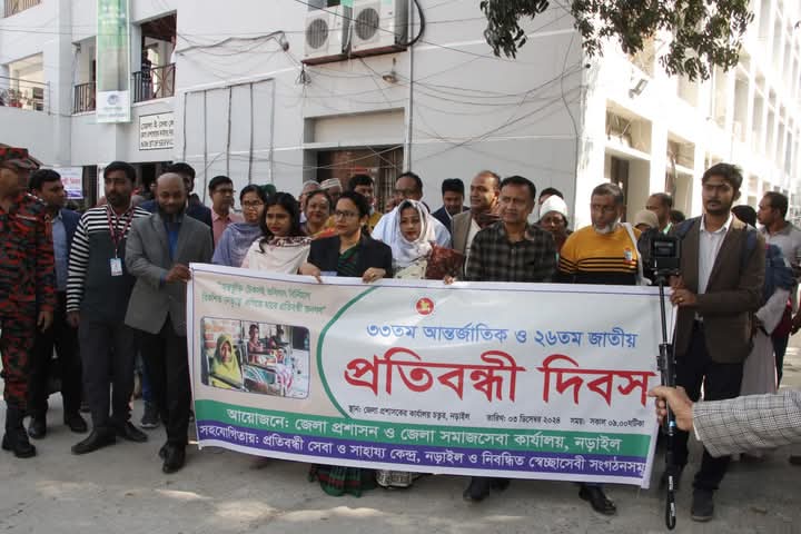 মঙ্গলবার সকালে জেলা প্রশাসকের কার্যালয় প্রাঙ্গণে জেলা প্রশাসন, নড়াইল এবং জেলা সমাজসেবা কার্যালয়, নড়াইল-এর আয়োজনে ৩৩ তম আন্তর্জাতিক প্রতিবন্ধী দিবস এবং ২৬ তম জাতীয় প্রতিবন্ধী দিবস উপলক্ষ্যে র্যালি, সহায়ক উপকরণ বিতরণ ও আলোচনা সভা অনুষ্ঠিত হয়েছে।