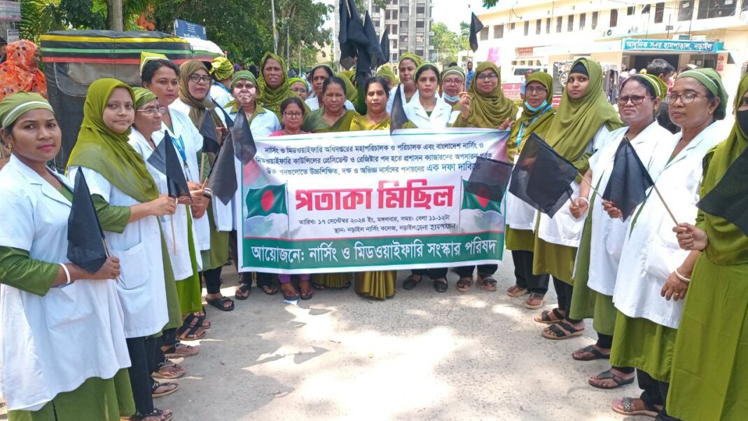 নার্সিং ও মিডওয়াইফারি অধিদপ্তরের মহাপরিচালক ও পরিচালক এবং বাংলাদেশ নার্সিং ও মিডওয়াইফারি কাউন্সিলের প্রেসিডেন্ট ও রেজিস্টার পদ হতে প্রশাসন ক্যাডারদের অপসারণ পূর্বক উক্ত পদ গুলোতে উচ্চ শিক্ষিত, দক্ষ ও অভিজ্ঞ নার্সদের পদায়নের ১ দফা দাবিতে নড়াইলে কালোপতাকা মিছিল ও বিক্ষোভ অনুষ্ঠিত হয়েছে।