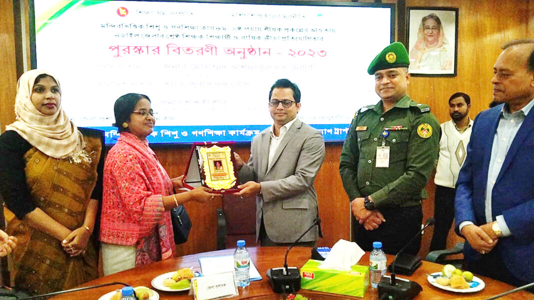 মন্দির ভিত্তিক শিশু ও গণশিক্ষা কার্যক্রম,নড়াইলের আয়োজনে সোমবার বেলা সাড়ে ১১টায় জেলা প্রশাসকের সম্মেলন কক্ষে জেলার ৫ জন শ্রেষ্ঠ শিক্ষক ও ১০ জন শ্রেষ্ঠ শিক্ষার্থীকে ক্রেস্ট ও সনদপত্র এবং বার্ষিক ক্রীড়া প্রতিযোগীতায় বিজয়ীদের মাঝে পুরস্কার তুলে দেন অনুষ্ঠানের প্রধান অতিথি জেলা প্রশাসক মোহাম্মদ আশফাকুল হক চৌধুরী ।