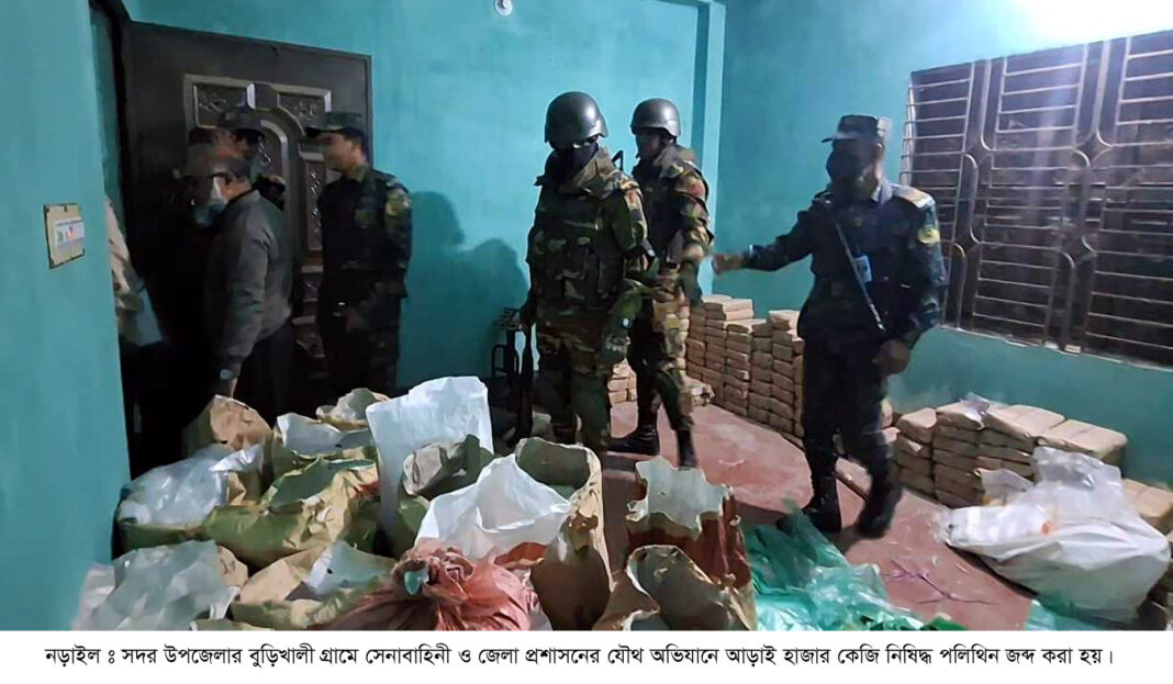 নড়াইলে সেনাবাহিনী ও জেলা প্রশাসনের যৌথ অভিযানে আড়াই হাজার কেজি নিষিদ্ধ পলিথিন জব্দ করে ধ্বংস করা হয়েছে। এসময় ইমরান হোসেন (৩৭) নামে এক যুবককে আটক করে ৫০ হাজার টাকা জরিমানা করা হয়। ইমরান হোসেন সদর উপজেলার সড়াতলা গ্রামের মৃত. নূর মোহাম্মদের ছেলে।