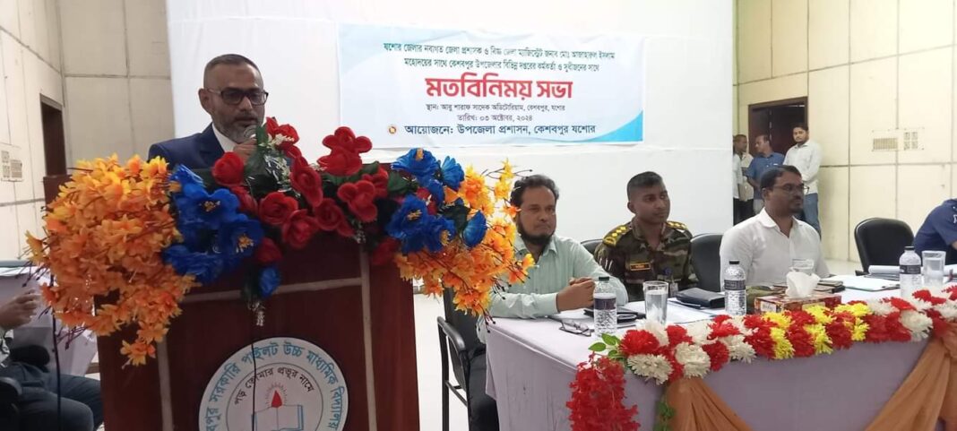 উপজেলা নির্বাহী অফিসার জাকির হোসেনের সভাপতিত্বে এ অনুষ্ঠানে বক্তব্য রাখেন, বাংলাদেশ সেনাবাহিনীর লেফটেন্যান্ট সাজিদ হোসেন, উপজেলা বিএনপির সাধারণ সম্পাদক প্রভাষক আব্দুর রাজ্জাক, পৌর বিএনপির সভাপতি আব্দুস সামাদ বিশ্বাস,উপজেলা জামায়াতে ইসলামীর ছাত্র বিষয়ক সম্পাদক এ্যাডভোকেট ওজিয়ার রহমান, কেশবপুর সদর ইউনিয়নের চেয়ারম্যান অধ্যাপক আলাউদ্দিন আলা, কেশবপুর প্রেসক্লাবের সাবেক সভাপতি আজিজুর রহমান, সুশীল সমাজের প্রতিনিধি এ্যাডভোকেট বদরুজ্জামান মিন্টু, বৈষম্যবিরোধী ছাত্রআন্দোলনের সমন্বয়ক সম্রাট হোসেন, পূজা পরিষদের নেতা দুলাল সাহা, বনিক সমিতির প্রতিনিধি আব্দুল ওয়াদুদ প্রমুখ।
