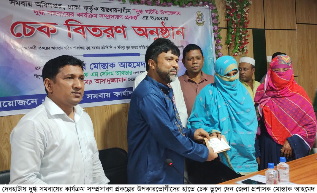 শুক্রবার (১১ জুলাই) উপজেলা সমবায় কার্যালয়ের আয়োজনে দুুগ্ধ ঘাটতি উপজেলায় দুগ্ধ সমবায়ের কার্যক্রম সম্প্রসারণ প্রকল্প” এর আওতায় চেক বিতরণ অনুষ্ঠান অনুষ্ঠিত হয়। অনুষ্ঠানে দেবহাটা উপজেলা নির্বাহী অফিসার মো.আসাদুজ্জামানের সভাপতিত্বে প্রধান অতিথি ছিলেন সাতক্ষীরা জেলা প্রশাসক মোস্তাক আহমেদ। বিশেষ অতিথি ছিলেন জেলা সমবায় অফিসার এফ এম সেলিম আখতার। অন্যন্যদের মধ্যে উপস্থিত ছিলেন পারুলিয়া ইউপি চেয়ারম্যান গোলাম ফারুক বাবু, দেবহাটা প্রেসক্লাবের সভাপতি মীর খায়রুল আলম, দেবহাটা রিপোর্টাস ক্লাবের সভাপতি সৈয়দ রেজাউল করিম বাপ্পা, উপজেলা সমবায় অফিসার মনোজিত মন্ডল, উপজেলা একাডেমিক সুপারভাইজার মিজানুর রহমান, সখিপুর মাধ্যমিক বিদ্যালয়ের প্রধান শিক্ষক শেখ তহিরুজ্জামান সহ বিভিন্ন পর্যয়ের ব্যক্তিবর্গ ও উপকারভোগীরা।