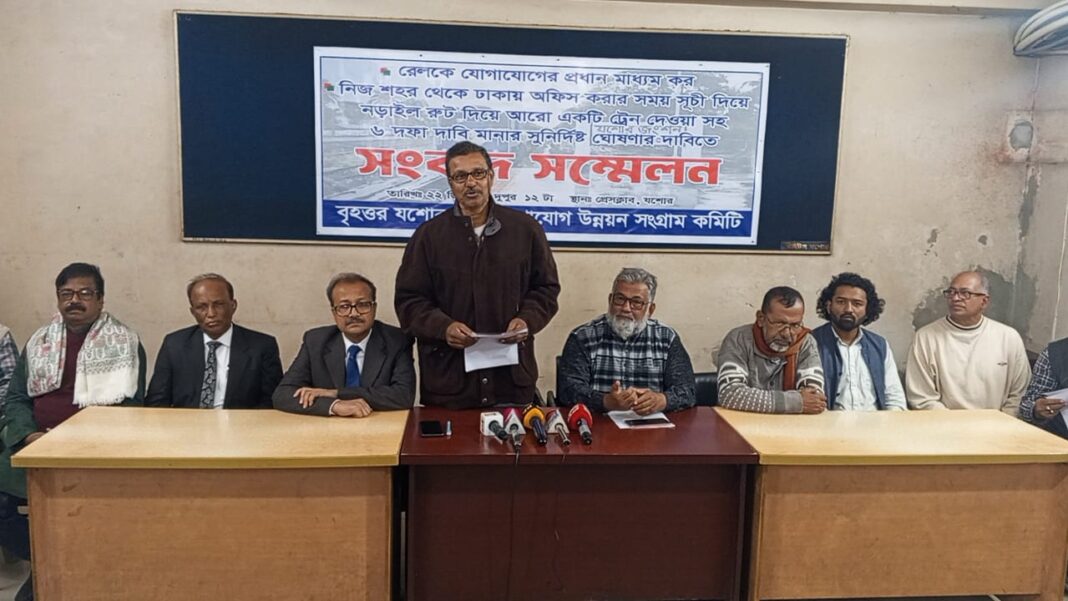 নিজস্ব প্রতিবেদক:পদ্মা সেতু হয়ে স্বল্প সময়ে যশোর থেকে ঢাকায় যাওয়া, রেলকে যোগাযোগের প্রধান মাধ্যমসহ ৬ দফা দাবিতে সংবাদ সম্মেলন করেছে বৃহত্তর যশোর রেল যোগাযোগ উন্নয়ন সংগ্রাম কমিটি। রোববার দুপুরে প্রেসক্লাব যশোরে এই সংবাদ সম্মেলন করে।