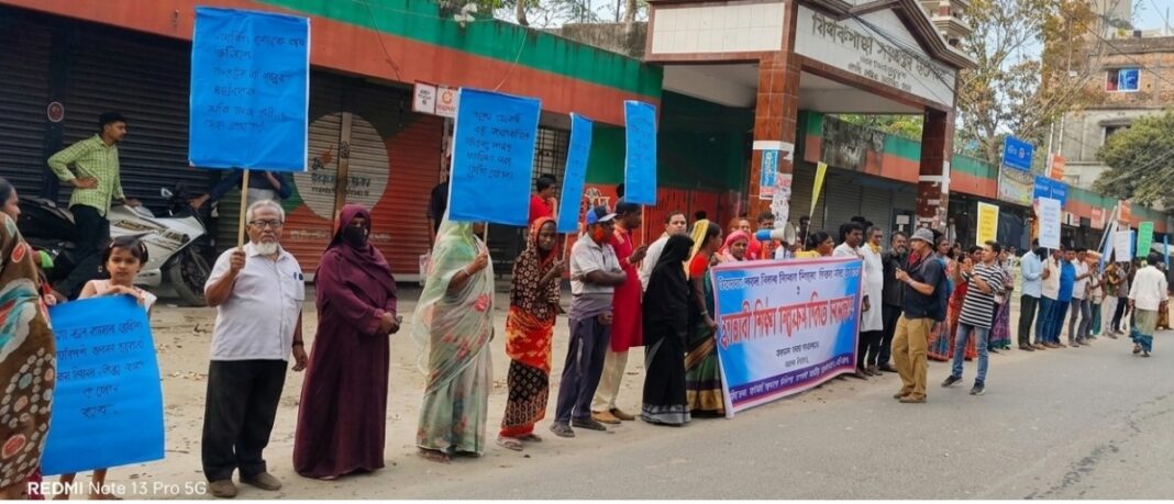 পাইকগাছায় সরকারি জমিতে হ্যাচারি নির্মাণের প্রতিবাদে মানববন্ধন