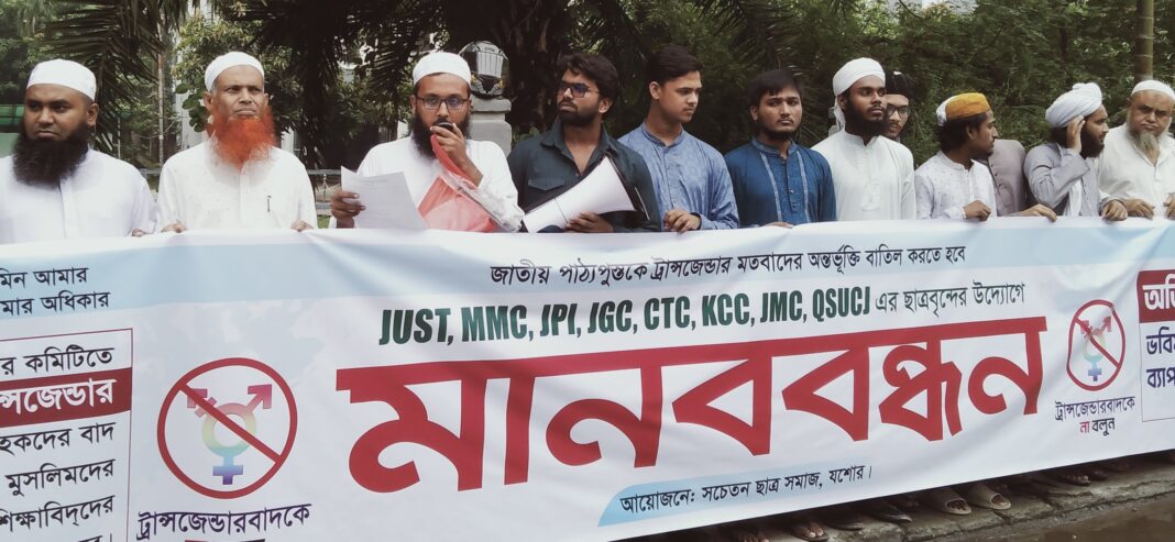 নিজস্ব প্রতিবেদক:পাঠ্যপুস্তক থেকে ট্রান্সজেন্ডার বাতিলসহ ৫দফা দাবিতে যশোরে মানববন্ধন অনুষ্ঠিত হয়েছে। শুক্রবার দুপুরে প্রেসক্লাব যশোরের সামনে এ মানববন্ধন অনুষ্ঠিত হয়। সচেতন ছাত্রসমাজ যশোরের উদ্যোগে মানববন্ধনে বিজ্ঞান ও প্রযুক্তি বিশ্ববিদ্যালয়, সরকারি সিটি কলেজ, এম এম কলেজ, পলিটেকনিক কলেজ, মেডিকেল কলেজসহ বিভিন্ন মাদরাসার শতাধিক শিক্ষক ও শিক্ষার্থীবৃন্দ উপস্থিত ছিলেন।