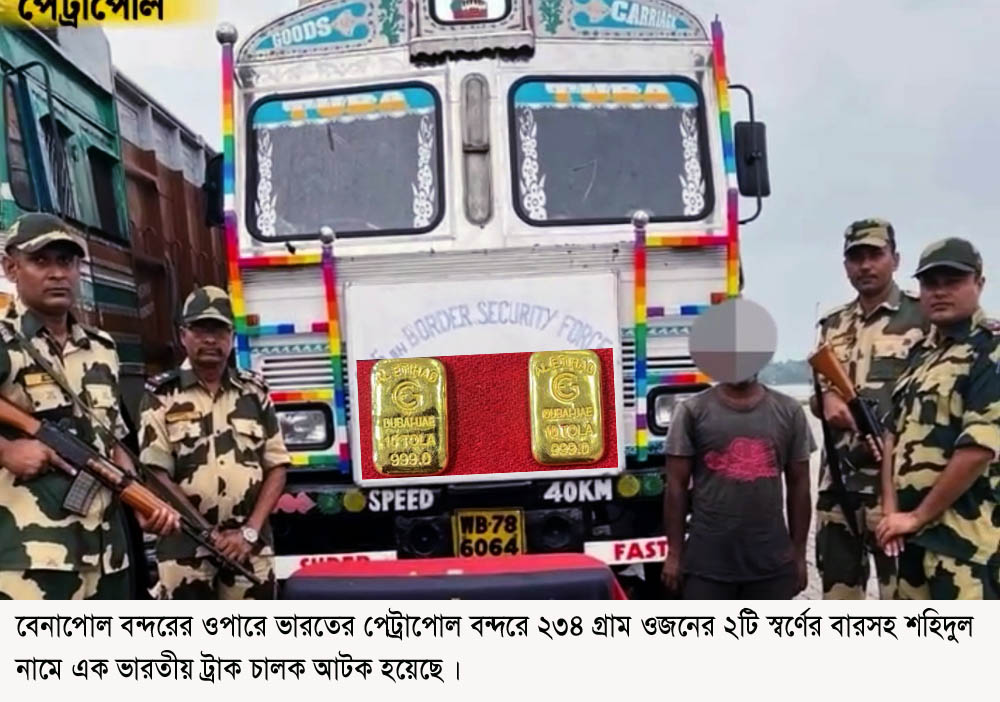 বেনাপোল প্রতিনিধিঃ বেনাপোল বন্দরের ওপারে ভারতের পেট্রাপোলে ২টি স্বর্ণের বার সহ শহিদুল গাজী (৪৫) নামে এক ভারতীয় ট্রাক চালককে আটক করেছে ভারতীয় সীমান্ত রক্ষী বাহিনী (বিএসএফ)।
