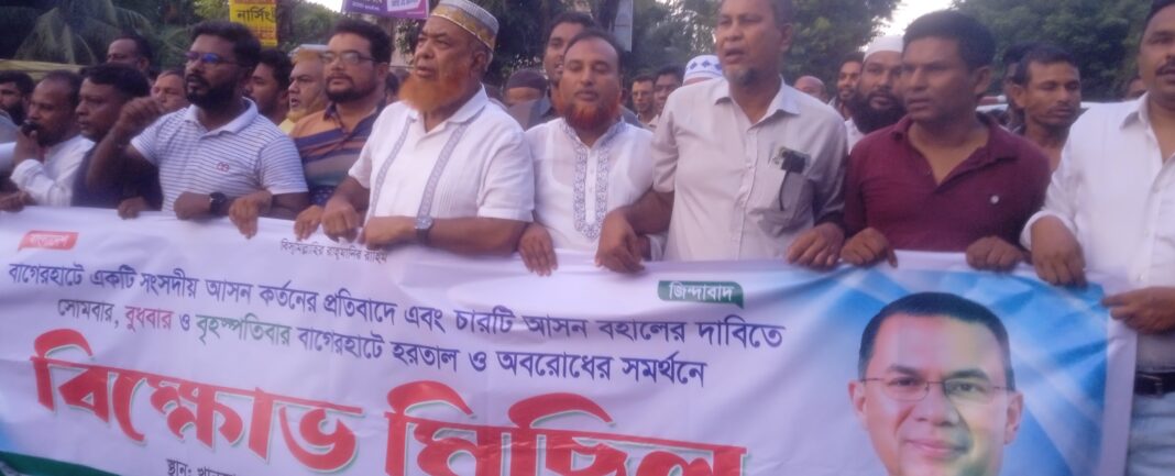 বাগেরহাটের ৪টি সংসদীয় আসন বহাল রাখার দাবিতে বুধ ও বৃহস্পতিবার ৪৮ ঘন্টা বাগেরহাট জেলা সদরসহ ৯টি উপজেলায় সর্বাত্বক হরতাল হরতাল সফল ও সার্থক করার দাবীতে বিক্ষোভ মিছিল ও সমাবেশ কর্মসূচি পালন করেছে জেলা যুবদলের সাবেক সভাপতি ষাটগু¤জ ইউনিয়নের সাবেক চেয়ারম্যান জননেতা ফকির তারিকুল ইসলাম এর নেতৃত্বে বিভিন্ন রাজনৈতিক দলের সর্বদলীয় সম্মিলিত কমিটি।গতকাল মঙ্গলবার বিকেলে সদরের বারাকপুর বাজার মাঠে একটি পথ সভা অনুষ্ঠিত হয়। উক্ত পথ সভায় বক্তৃতা করেন, জেলা যুবদলের সাবেক সভাপতি ষাটগুম্বজ ইউনিয়নের সাবেক চেয়ারম্যান জননেতা ফকির তারিকুল ইসলাম,মো: হারুন অর রশীদ,বিএনপি নেতা আল মামুন টিপু,শেখ মহিদুল ইসলাম,মো: আলম মোল্লা,মো: শিমুল,মো: নুরুল ইসলাম,মো: আরিফ হোসেন প্রমুখ।পথ সভা শেষে একট বিক্ষোভ মিছিল বারাকপুর বাজারসহ রুপসা বাগেরহাট মহা সড়কের বিভিন্ন সড়ক প্রদক্ষিন করে।সভায় বক্তারাআগামী ১০,০৯,ও ১১,০৯,২৫ তারিখ জেলা ব্যাপী সব ধরনের যানবাহন চলাচল, দোকানপাট, ব্যাবসা প্রতিষ্ঠান, সরকারি বেসরকারী অফিস ও স্কুল কলেজ বন্ধ ছিল। মোংলা বন্দরে জেটেতে পন্য ওঠানামা ও পরিবহনও বন্ধসহ সকাল সন্ধ্যা হরতাল পালনের জন্য সকলের প্রতি উদাত্ত আহব্বান জানান।