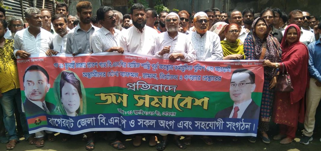 বাগেরহাট প্রতিনিধি:কেন্দ্র ঘোষিত কর্মসূচির অংশ হিসেবে ২৯ জুলাই ঢাকার প্রবেশপথে বিএনপি ঘোষিত শান্তিপূর্ণ অবস্থান কর্মসূচিতে পুলিশ এবং আওয়ামী সন্ত্রাসীদের যৌথ আক্রমণ হামলা এবং নির্যাতন ও গণহারে গ্রেফতারের প্রতিবাদে জনসমাবেশ করেছে বাগেরহাট জেলা বিএনপি। সোমবার (৩১ জুলাই) বেলা ১১ টায় বাগেরহাট জেলা বিএনপি অফিস থানার মোড়ে এই কর্মসূচি পালন করে তারা। বাগেরহাট জেলা বিএনপির আহবায়ক ইঞ্জিনিয়ার এটিএম আকরাম হোসেন তালিমের সভাপতিতে অনুষ্ঠিত সভাটি সঞ্চালনার দায়িত্বে ছিলেন বাগেরহাট জেলা বিএনপির সদস্য সচিব মোজাফফর রহমান আলম।