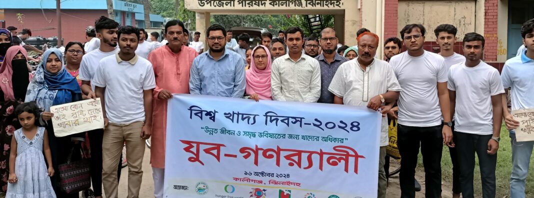 ঝিনাইদহের কালীগঞ্জে বিশ্ব খাদ্য দিবস উপলক্ষে যুব গণর্যালী ও আলোচনা সভা অনুষ্ঠিত হয়েছে। এছাড়াও খাদ্য দিবসে ছয়টি দাবিতে উপজেলা নির্বাহী অফিসারে মাধ্যমে যুব ও ক্রীড়া মন্ত্রণালয় ও শ্রম কর্মসংস্থান মন্ত্রণায়ের উপদেষ্টার কাছে বাংলাদেশ যুব ছায়া সংসদ ও কালীগঞ্জ ইয়ুথ এগেইনস্ট হাঙ্গারে পক্ষ থেকে একটি স্মারকলিপি পেশ করা হয়।