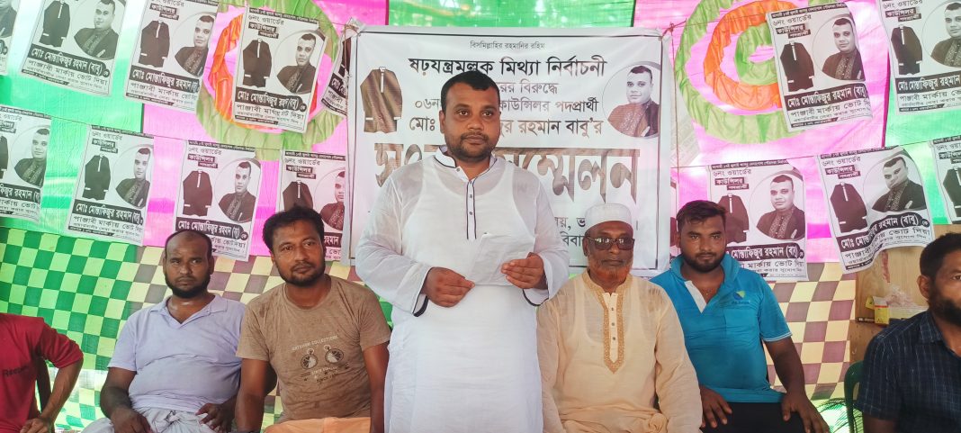 আয়োজিত সংবাদ সম্মেলনে লিখিত বক্তব্য পাঠে পাঞ্জাবী প্রতিকের প্রার্থী মোস্তাফিজুর রহমান বাবু বলেন আমার জনপ্রিয়তায় ইশর্^ানিত হয়ে প্রতিদন্দী প্রার্থীর সমর্থকরা এলাকায় নানা রকমের মিথ্যা ও বিভ্রান্তীকর অপপ্রচার চালাচ্ছে। ষঢ়যন্ত্রমূলক এলাকায় অপপ্রচার ছড়িয়েছে আমি নির্বাচন হতে সরে গেছি। এতে করে আমার নির্বাচনী কার্যক্রম পরিচালনায় ব্যঘাত ঘটছে ও নির্বাচনী আমেজ নষ্ঠ হচ্ছে।