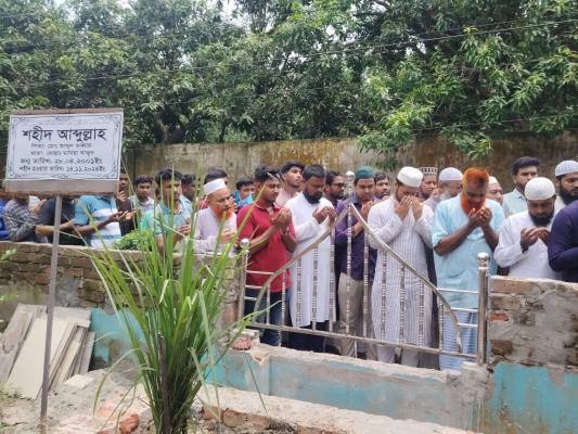 মঙ্গলবার (২২ জুলাই) বিকালে যশোরের শার্শা উপজেলার বেনাপোল সীমান্তবর্তী বড়আঁচড়া গ্রামে শহীদ আব্দুল্লাহর বাড়িতে গিয়ে শহীদ আব্দুল্লাহর কবর জিয়ারত করেন। এ সময় শহীদের আত্মার মাগফিরাত কামনা করে বিশেষ দোয়া করা হয়।