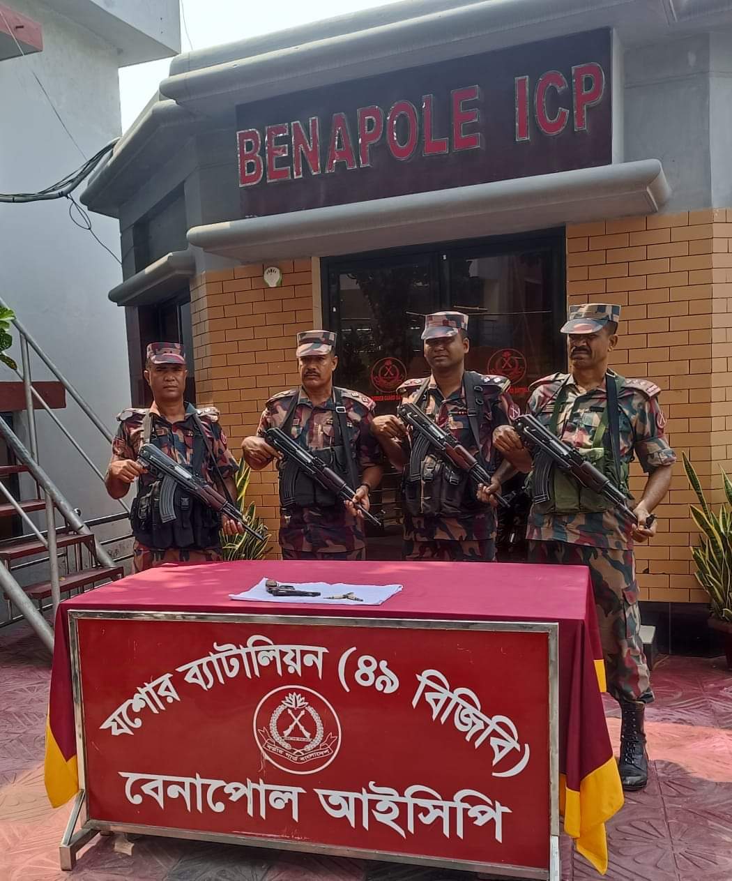 যশোর ৪৯ বিজিবির এর অধিনায়ক লেঃ কর্নেল সাইফুল সিদ্দিকী,এসপিসি,পিএসসি জানান, গোপন সংবাদের ভিত্তিতে বেনাপোল আইসিপি ক্যাম্পের নায়েক সুবেদার ফরিদ উদ্দিনের নেতৃত্বে বেনাপোল সাদীপুর মাঠপাড়া পাকা রাস্তা এলাকায় অভিযান চালালে বিজিবির উপস্থিতি টের পেয়ে একজন অজ্ঞাত ব্যক্তি দৌঁড়ে পালিয়ে যায়। পরে, উক্ত স্থানে তল্লাশি করে ১টি দেশি পিস্তল ও ৩ রাউন্ড গুলি উদ্ধার করা হয়। এ ব্যাপারে আইনি ব্যবস্থা প্রক্রিয়াধীন রয়েছে বলে জানান বিজিবির এই কর্মকর্তা।