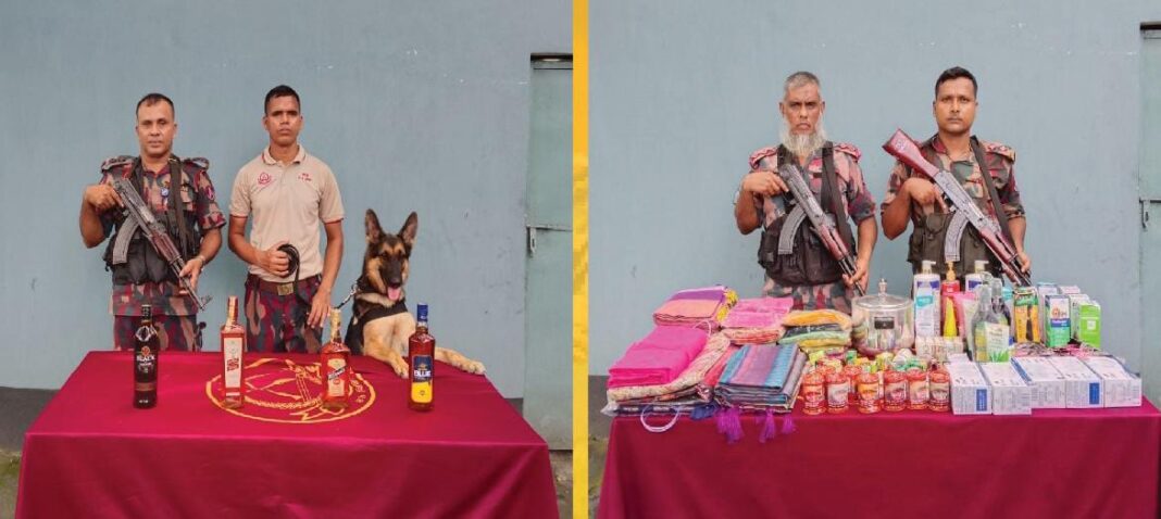 বিজিবির পাঠানো এক সংবাদ বিজ্ঞপ্তিতে জানানো হয়, অভিযানে বিদেশি মদ, শাড়ি, বিভিন্ন ধরনের পোশাক সামগ্রী, তামাক, পান মসলা, প্রেশার কুকার ও কসমেটিকস সামগ্রী উদ্ধার করা হয়েছে। জব্দকৃত পণ্যের আনুমানিক বাজারমূল্য প্রায় ২ লাখ ৭১ হাজার ৬০০ টাকা।