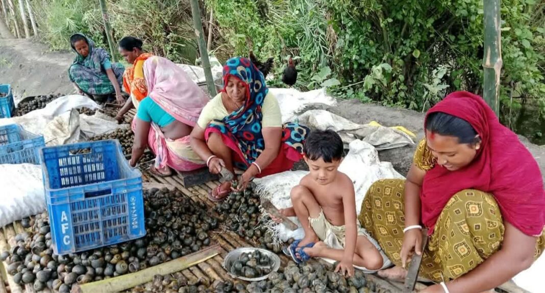 স্থানীয়রা জানান, ছোট ছোট নৌকায় করে উপজেলার বিভিন্ন বিল, খাল ও ধানের ক্ষেত থেকে শামুক কুড়িয়ে আনা হচ্ছে। একজন শ্রমিক দিনে গড়ে ৩ থেকে ৪ বস্তা শামুক সংগ্রহ করতে পারেন। মাছের ঘের, বিলের পাড় এবং বিলসংলগ্ন সড়কের পাশে এসব শামুক কেনাবেচা করা হয়। পরে স্থানীয় পাইকারেরা শামুক সংগ্রহ করে বস্তাবন্দী করেন।