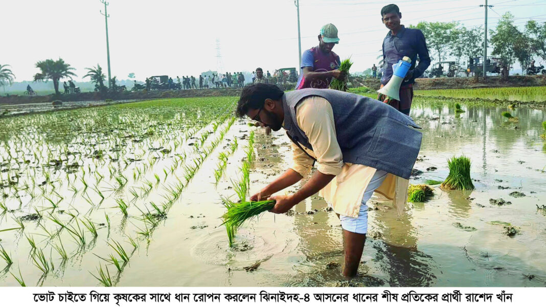 নিজ নির্বাচনী এলাকার কৃষকদের পাশে দাঁড়িয়ে ব্যতিক্রমী নির্বাচনী প্রচারণায় অংশ নিলেন ঝিনাইদহ-৪ আসনের বিএনপি মনোনীত ধানের শীষ প্রতিকের প্রার্থী ও গণ অধিকার পরিষদের সাবেক সাধারণ সম্পাদক রাশেদ খাঁন। কৃষকের কাছে ভোট চাইতে গিয়ে তিনি সরাসরি মাঠে নেমে ধান রোপণ করেন।