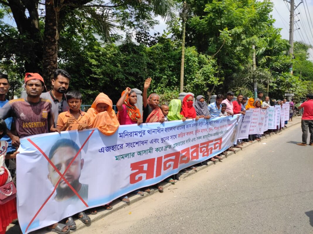 নিজস্ব প্রতিবেদক: যশোরের মনিরামপুর উপজেলার হাকোবা গ্রামের ভ্যান চালক মিন্টু হোসেন হত্যার মামলার প্রধান আসামি বড় সাব্বিরসহ খুনের সাথে জড়িত সকলের সর্বোচ্চ শাস্তির দাবিতে এবং আসামীদের অব্যাহত হুমকির প্রতিবাদে মানববন্ধন কর্মসূচি পালন করেছে নিহতের পরিবার।